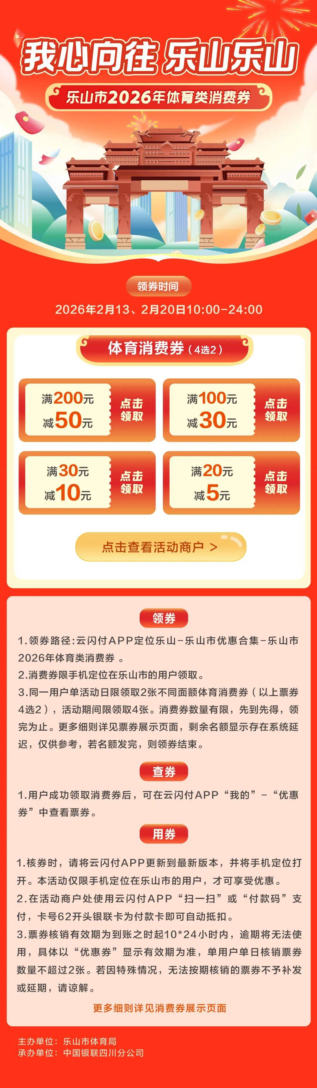 2026年2月13日、2月20日上午10:00-24:00开通领券入口,所有在乐山地区的云闪付APP用户(需允许云闪付APP使用手机定位权限,限手机定位在乐山)都可以领取。你可以直接登录云闪付APP首页访问消费券活动页面查看活动详情并参与领券。每轮消费券发放时,每种面额限领1张,每人限领2张。消费券数量有限,先到先得,记得调好闹钟,下手一定要快!