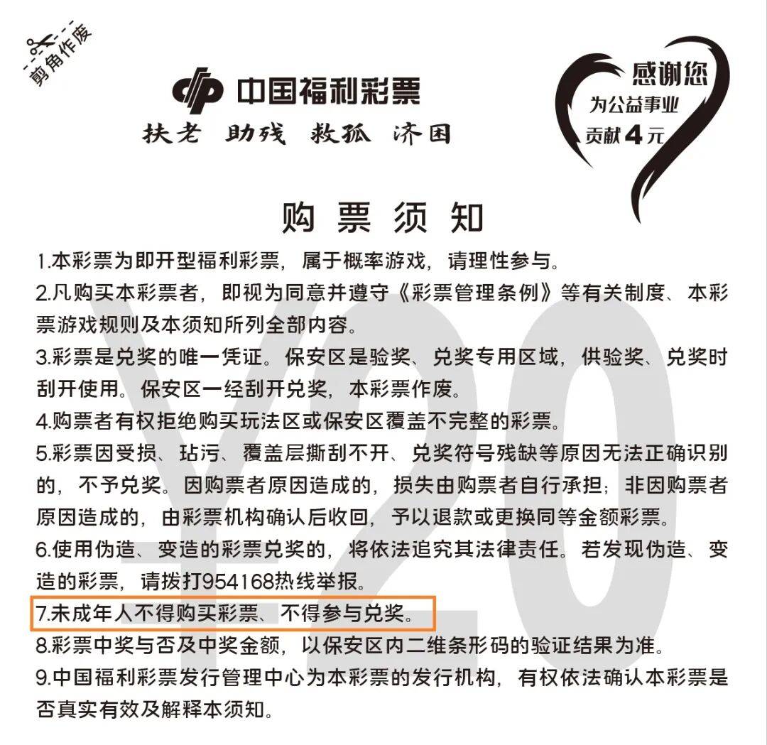 为了保护未成年人的身心健康,未满18周岁的未成年人不得购买彩票。同时,请福彩代销者严格遵守,切勿向未成年人出售彩票及为其兑奖。